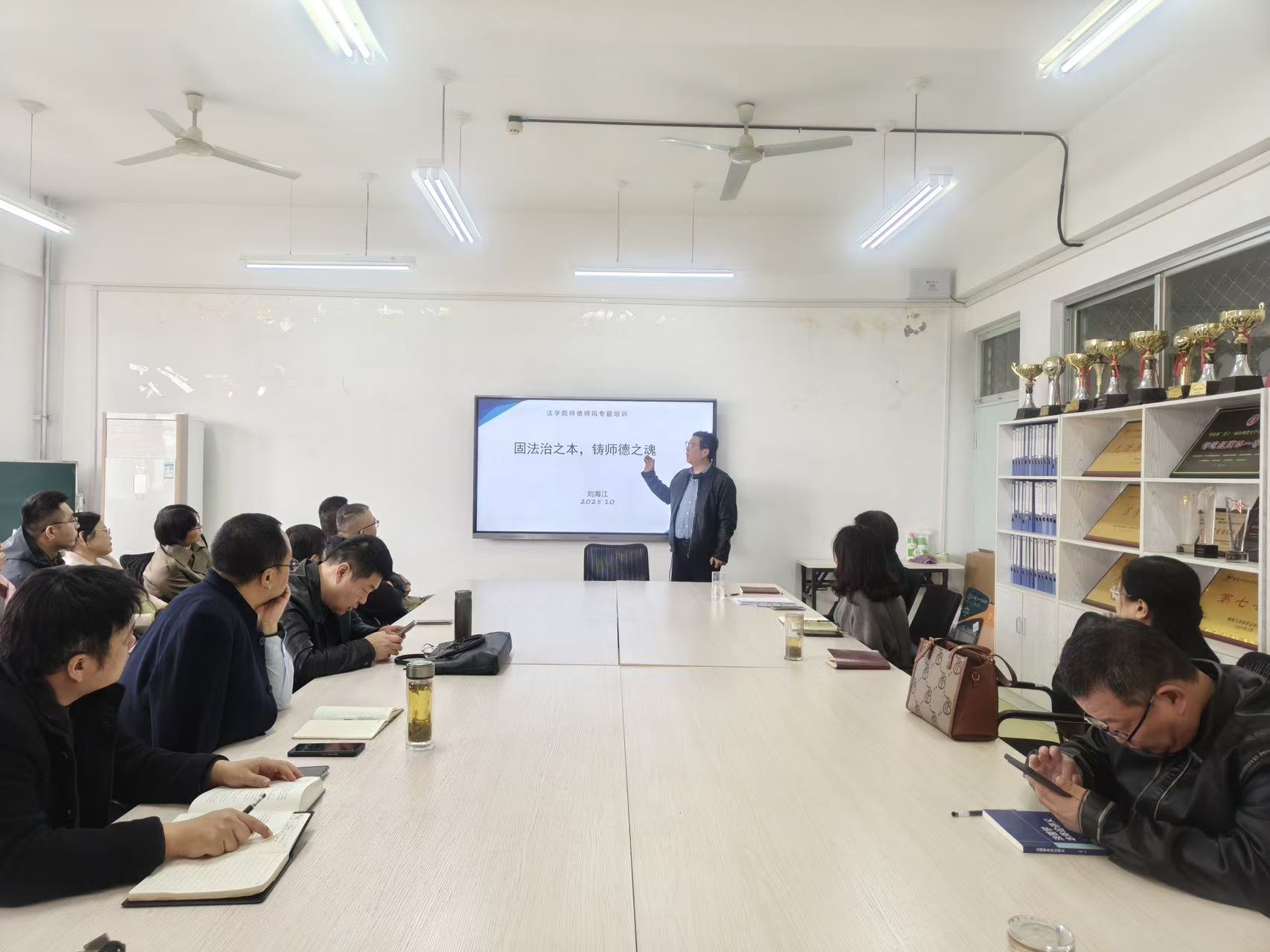 刘海江教授从师德和法治的关系、高校教师需遵守的法律准绳、常见的违法行为及违法代价四个方面进行了讲述,同时还结合近年来全国教育系统发生学术不端、利用职务之便谋取不当利益、性骚扰、与学生发生不正当关系、发表不当言论、接受学生家长礼品以及酒驾、侵占科研经费等师德失范典型案例向与会教师进行了警示教育,指出了师德失范对自己和他人带来的危害和代价,教育大家在今后的工作中一定要恪守《新时代高校教师职业行为十项准则》,争做“有理想信念,有道德情操,有扎实学识,有仁爱之心”的好老师。