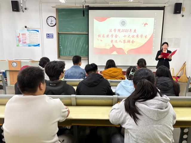 为选拔品学兼优、素养卓越的优秀学生楷模,引导学生汲取榜样力量,推进优良学风建设,10月29日,法学院于西校区10#C520开展校长奖学金公开答辩会。法学院党委副书记、副院长刘洁,辅导员孟冠军、李宁、马丽亚及兼职辅导员陈星宇担任答辩评委,部分学生代表参加此次活动。