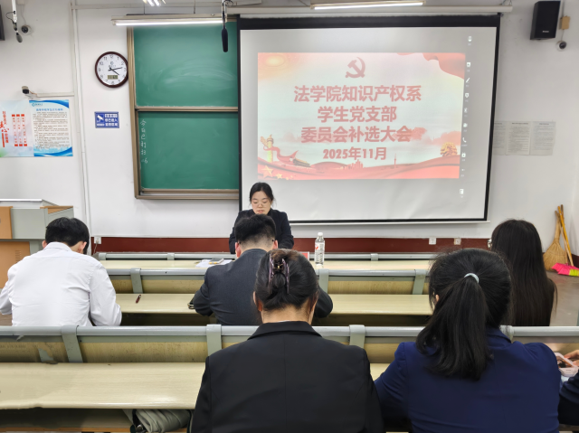 为全面加强基层党组织建设,优化支部委员会人员结构,11月6日,法学院知识产权系学生党支部于西校区10#C520召开补选支部委员党员大会,知识产权系学生党支部书记李宁主持本次大会,全体党员参加会议。