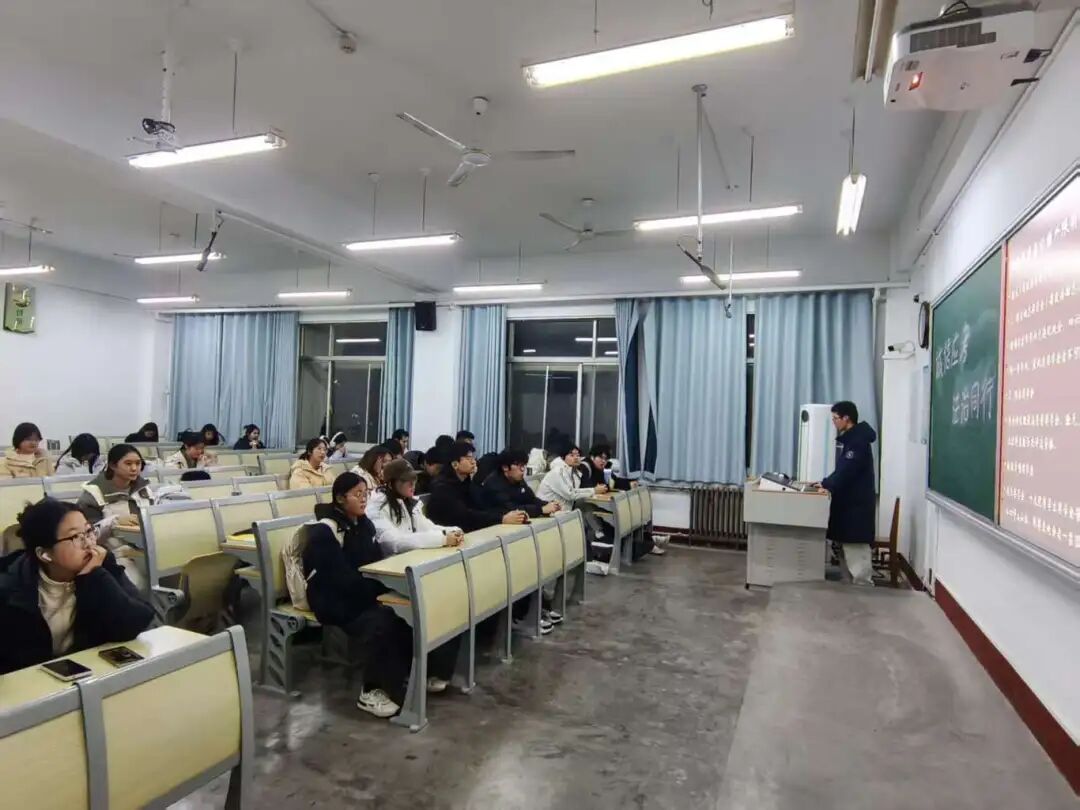 活动过程中,付明浩围绕本次考试安排、评奖评优机制、文件解读三方面展开讲解。 在考试安排环节,明确了具体的考试时间、考场分布,并对考场纪律做出严格要求;在讲解评奖评优机制时,付明浩系统梳理了各类奖学金的评选维度,着重强调“诚信考试是评奖评优的前置红线”,以真实案例警示学生作弊带来的严重后果;在文件解读板块,以《国家教育考试违规处理办法》《聊城大学学生违规处分管理规定》等文件为依据,深入剖析考试违规行为的认定标准、处分后果,以及其对个人学业和学位授予所产生的严重影响。 通过系统讲解,促进在场学生对考试纪律、诚信应考重要性以及违纪后果的全面认识,明确行为底线,进一步强化规则意识和法治观念。